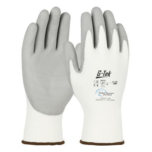 Gants de manutention GTEK® 3RX enduction PU en plastique recyclé PIP Approche écoresponsable : oui CE : oui Coloris : Blanc/gris Compatible écran tactile : oui Enduction matière : Polyuréthane Gant taille : 9 Global Recycled Standard : oui Jauge gant : 13 Matière textile : Polyéthylène Modèle : 31131R Norme EN 388 : 3131X Norme EN 420 : oui Produit recyclé : 70 % Surface d'enduction : Paume Gants fabriqués à partir de bouteilles plastiques recyclées. Possèdent une enduction en polyuréthane sur la paume et le bout des doigts offrant une excellente résistance à l’abrasion et une adhérence sur surface sèche ou humide. Enduction respirante et très confortable à porter. Compatible avec les écrans tactiles Gants de manutention GTEK® 3RX enduction PU en plastique recyclé, Enduction matière: Polyuréthane, Matière: Polyéthylène, Surface d'enduction: Paume, Coloris: Blanc/gris, Gant taille: 9, Modèle: 31131R, Jauge gant: 13, Produit recyclé: 70 %, Compatible écran tactile: oui, Approche écoresponsable: oui, CE: oui