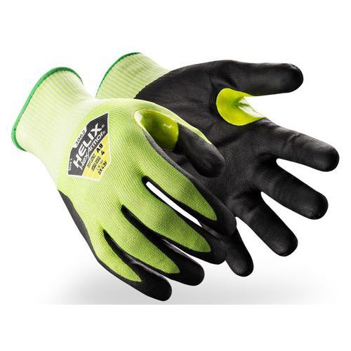Gants de protection anti coupures Helix® 3062 HexArmor Ambidextre : non CE : oui Coloris : Noir/jaune Compatible écran tactile : oui Coupure ISO 13997 : F Enduction matière : Nitrile Gant matière : Polyéthylène haute densité Gant protection : Coupure Gant taille : 10 Jauge gant : 18 Matière textile : Polyéthylène haute densité Milieu d'utilisation du gant : Sec Nb de paires : 1 Norme EN 420 : oui Surface d'enduction : Paume Usage alimentaire : non Usage unique : non Gant de protection Helix 3062 contre les coupures (niveau F), support jauge 18 HPPE/fibres d'acier, enduction paume en mousse nitrile offrant une adhérence en milieux secs comme humides, coloris haute visibilité, compatible avec les écrans tactiles. Les gants Helix 3062 d'Hexarmor sont parfaits pour les environnements à haut risque de coupures. Leur matériau de haute qualité garantit une sécurité optimale tout en offrant une grande flexibilité et un confort durable pour les utilisateurs. Gants de protection anti coupures Helix® 3062, Enduction matière: Nitrile, Surface d'enduction: Paume, Gant matière: Polyéthylène haute densité, Gant taille: 10, Coloris: Noir/jaune, Coupure ISO 13997: F, Jauge gant: 18, Gant protection: Coupure, Ambidextre: non, Matière textile: Polyéthylène haute densité, Usage unique: non, Nb de paires: 1, Compatible écran tactile: oui, Milieu d'utilisation du gant: Sec, CE: oui, Usage alimentaire: non