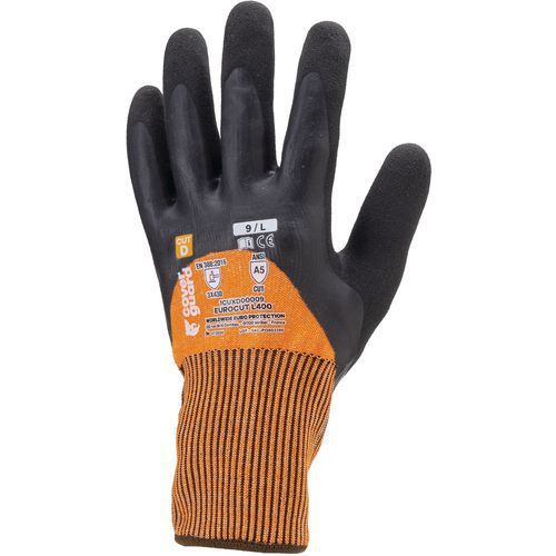 Descriptif du produit :Gants Eurocut L400 CUT D. HPPE J13 Coverguard Ambidextre : non Coloris : Orange Enduction matière : Latex Gant taille : 11 Matière textile : Polyéthylène haute densité Surface d'enduction : 3/4 main Tricot orange sans couture à base de HDPE, polyester, élasthanne, jauge 13. Double enduction : 3/4 main en latex lisse, paume en mousse de latex noire. Forme ergonomique. Poignet t ...