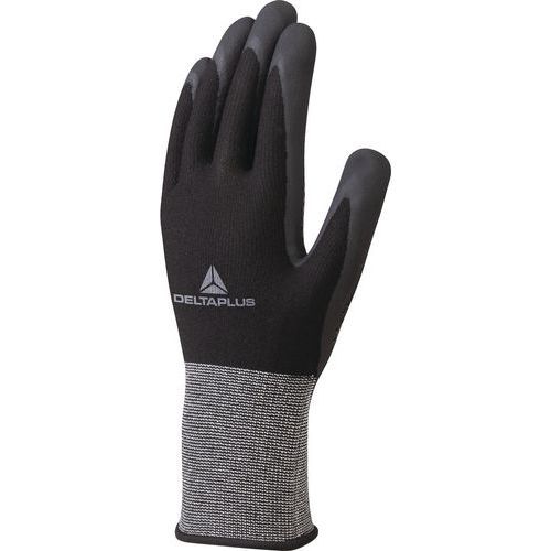 Descriptif du produit :Gants tricot polyester spandex paume + picots nitrile Delta Plus CE : oui Coloris : Noir Compatible écran tactile : non Enduction matière : Nitrile Gant taille : 11 Jauge gant : 15 Matière : Polyester Nb de paires : 1 Norme EN 420 : oui Surface d'enduction : Paume Usage alimentaire : non Usage unique : non Polyester/Spandex. Enduction nitrile sur paume et bout des doig ...