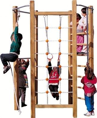 Structure : Pin du Nord imprégné en autoclave class IV. Montants sont constitués par des poteaux cadres section 9 x 9 cm.Composition : 6 éléments : 1 filet à grimper avec cordage en polypropylène armé et jonction en plastique, 1 mât de pompiers en acier rond galvanisé, 1 espalier avec barreaux en iroko Ø 45 mm, 1 corde à grimper armée, 1 paire d\'anneaux, 1 barre horizontale bass ...