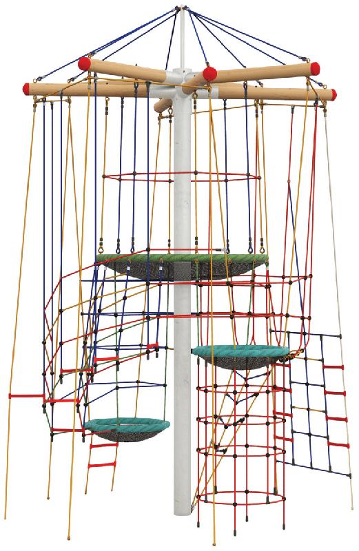 1 mât central en acier galvanisé à chaud (Ø 194 mm), longueur 6.20 m8 rondins en bois lamellé-collé1 Nid de pie (Ø 1.90 m)2 Nids d’abeille (Ø 1.00 m)1 échelle à grimper1 filet à grimper1 cheminée à grimper2 filets de passage en colimaçonFilets et cordages en câble Hercule Ø 16 mmColoris : conforme à l’imageLe câble Hercule est composé de 6 torons acier de Ø 2.5 mm, eux-mêmes composés de 7 fils zingués. Ce procédé de fabrication lui confère une grande résistance et une stabilité extrême. Chaque toron est gainé de fibre polyester de première qualité, qui offre une haute résistance à l\'abrasion et une grande stabilité anti-UV. Après le câblage des torons, le cordage Hercule subit un traitement de surface de finition. L\'ensemble de ces opérations permet d\'obtenir une excellente résistance à l\'abrasion.Pour une installation à moins de 10 km de la mer, il est nécessaire de prévoir des accessoires inox, merci de nous consulter.Ø zone d\'impact 8,20 m.Ø 4 m