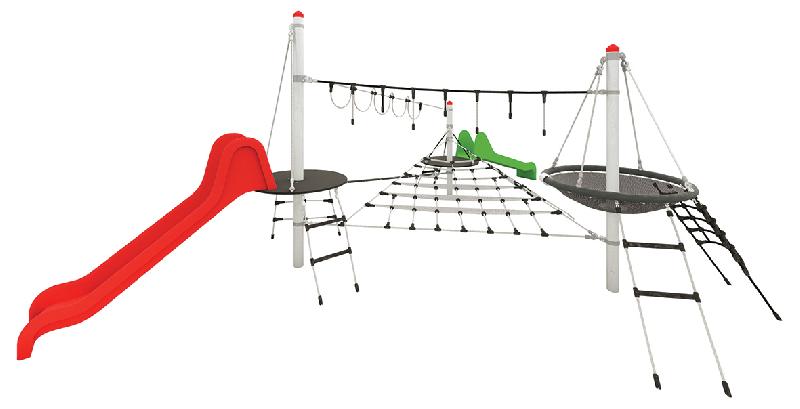 Descriptif du produit :3 poteaux en acier galvanisé à chaud (Ø 102 mm), longueurs 3.40 m, 3.00 m et 2.40 m, avec chapeaux PE noirs2 plateformes Ø 1.00 m x 0.10 m2 toboggans (hauteurs d’assise 0.90 m et 0.60 m)2 filets à grimper3 échelles à grimper2 filets triangulaires1 slackline1 corde avec guirlande de suspension1 corde suspendue1 Nid d’oiseau (Ø 1.20 m)Filets et cordages en câble Hercule Ø 16 mmColoris ...