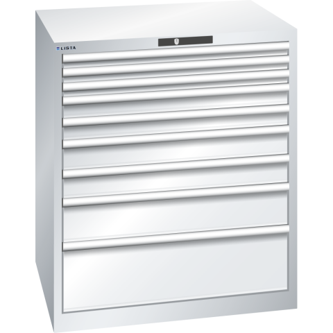 - Les armoires à tiroirs LISTA sont des solutions de rangement hautement personnalisables, offrant une sécurité et une protection optimales pour divers outils et marchandises. Construites pour une utilisation maximale et une excellente durabilité, ces armoires s'intègrent de manière flexible dans tout environnement professionnel.Dimensions : H 100 x L 87 x P 72,5 cm Dimensions des tiroirs : 9 tiroirs avec des hauteurs frontales variées 3 x 5 / 2 x 7,5 / 2 x 10 / 1 x 15 / 1 x 25 cm, largeur et profondeur utiles 76,5 x 61,2 cmCapacité de charge élevée : Bâti jusqu'à 4 t, Tiroirs de 75 à 200 kg chacunSécurité des tiroirs : Système anti-décrochage et blocage individuelProtection contre la corrosion : Laquage et peinture écologiquesOrganisation optimale : Matériel de subdivision LISTA et étiquetage professionnelFlexibilité et adaptation : Pré-perçages pour accessoires diversDéplacement silencieux : Glissière sans traverse pour un fonctionnement fluideCouleur : Gris clair RAL 7035 ou bleu clair RAL 5012Système de fermeture sécurisé : Serrure à clé Key Lock.