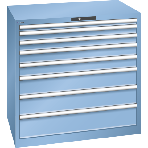 - Les armoires à tiroirs LISTA sont des solutions de rangement hautement personnalisables, offrant une sécurité et une protection optimales pour divers outils et marchandises. Construites pour une utilisation maximale et une excellente durabilité, ces armoires s'intègrent de manière flexible dans tout environnement professionnel.Dimensions : H 100 x L 102,3 x P 72,5 cm Dimensions des tiroirs : 8 tiroirs avec des hauteurs frontales variées 1 x 5 / 2 x 7,5 / 2 x 15 / 1 x 20 / 1 x 20 cm, largeur et profondeur utiles 91,8 x 61,2 cmCapacité de charge élevée : Bâti jusqu'à 4 t, Tiroirs de 75 kg chacunSécurité des tiroirs : Système anti-décrochage et blocage individuelProtection contre la corrosion : Laquage et peinture écologiquesOrganisation optimale : Matériel de subdivision LISTA et étiquetage professionnelFlexibilité et adaptation : Pré-perçages pour accessoires diversDéplacement silencieux : Glissière sans traverse pour un fonctionnement fluideCouleur : Gris clair RAL 7035 ou bleu clair RAL 5012Système de fermeture sécurisé : Serrure à clé Key Lock.