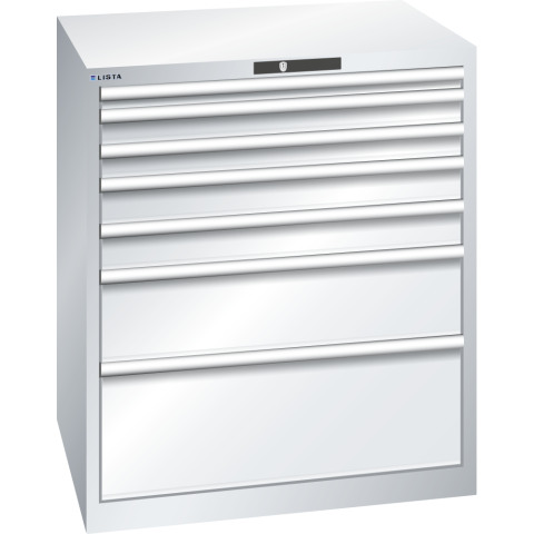 - Les armoires à tiroirs LISTA sont des solutions de rangement hautement personnalisables, offrant une sécurité et une protection optimales pour divers outils et marchandises. Construites pour une utilisation maximale et une excellente durabilité, ces armoires s'intègrent de manière flexible dans tout environnement professionnel.Dimensions : H 100 x L 87 x P 72,5 cm Dimensions des tiroirs : 7 tiroirs avec des hauteurs frontales variées 1 x 5 / 2 x 7,5 / 2 x 10 / 1 x 20 / 1 x 30 cm, largeur et profondeur utiles 76,5 x 61,2 cmCapacité de charge élevée : Bâti jusqu'à 4 t, Tiroirs de 75 à 200 kg chacunSécurité des tiroirs : Système anti-décrochage et blocage individuelProtection contre la corrosion : Laquage et peinture écologiquesOrganisation optimale : Matériel de subdivision LISTA et étiquetage professionnelFlexibilité et adaptation : Pré-perçages pour accessoires diversDéplacement silencieux : Glissière sans traverse pour un fonctionnement fluideCouleur : Gris clair RAL 7035 ou bleu clair RAL 5012Système de fermeture sécurisé : Serrure à clé Key Lock.