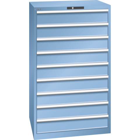 - Les armoires à tiroirs LISTA sont des solutions de rangement hautement personnalisables, offrant une sécurité et une protection optimales pour divers outils et marchandises. Construites pour une utilisation maximale et une excellente durabilité, ces armoires s'intègrent de manière flexible dans tout environnement professionnel.Dimensions : H 145 x L 87 x P 72,5 cm Dimensions des tiroirs : 9 tiroirs avec des hauteurs frontales variées 9 x 15 cm, largeur et profondeur utiles 76,5 x 61,2 cmCapacité de charge élevée : Bâti jusqu'à 4 t, Tiroirs de 200 kg chacunSécurité des tiroirs : Système anti-décrochage et blocage individuelProtection contre la corrosion : Laquage et peinture écologiquesOrganisation optimale : Matériel de subdivision LISTA et étiquetage professionnelFlexibilité et adaptation : Pré-perçages pour accessoires diversDéplacement silencieux : Glissière sans traverse pour un fonctionnement fluideCouleur : Gris clair RAL 7035 ou bleu clair RAL 5012Système de fermeture sécurisé : Serrure à clé Key Lock.