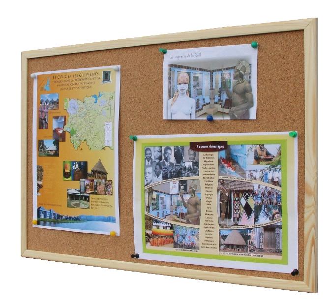 Descriptif du produit :Modèle photographié 60 x 80 cm 8 A4Tableau d’affichage surface en liège punaisable Encadrement en pin naturel. Support en fibre de bois ép.6 mm avec surface en liège naturel Fixation par crochets (visserie non fournie).
