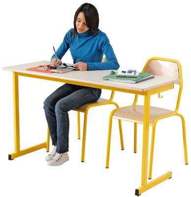 Descriptif du produit :Chants épais en ABS.Piétement 40 x 25 cm, ép. 1,5 mm, soudé sur un cadre en tube 50 x 20 mm ép. 1,5 mm, revêtu époxy.Lot de 15 tables vendu avec 30 chaises :Chaise Etude 4 pieds en taille 6, empilable jusqu\'à 4.Assise, L/P 41 x 40 cm, épaisseur 8 mm et dossier encastré épaisseur 6 mm en hêtre multiplis verni naturel.Piétement revêtu époxy, équipé de patins plastique.Encombrement ...