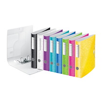 Sous sa couverture laminée brillante et colorée, le classeur à levier Leitz WOW 180° cache un mécanisme unique, breveté et garanti ...