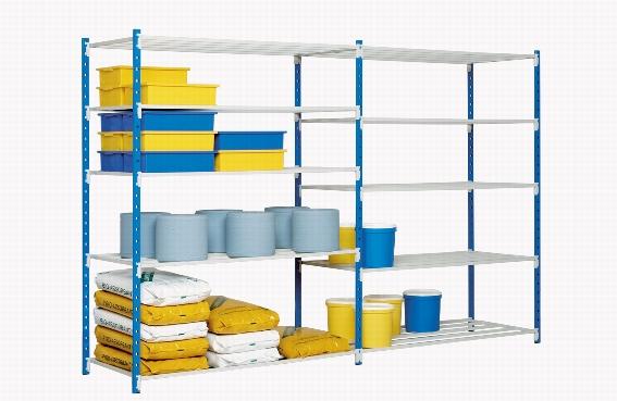 S\'adapte sur le rayonnage universel MANORGA.En acier finition peinture époxy coloris bleu RAL 5015. Charge maxi par tablette : 46 ...