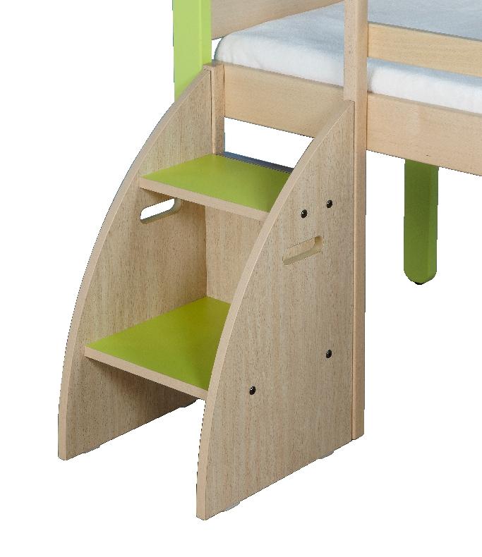 Descriptif du produit :Ossature panneau mélaminé coloris hêtre et dessus des marches en mélaminé de couleur.L/P marches : 31 x 32 x 18 cm. L/H/P hors tout : 35 x 64 x 37 cm. 10 kg.