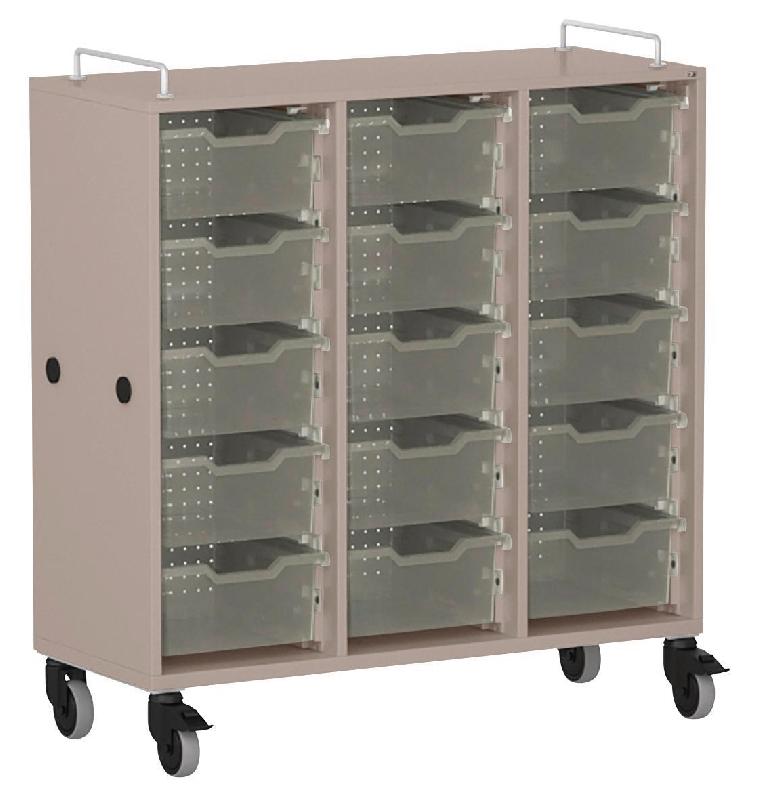 Armoire basse corps en LIGNOpal, panneau de particules fines mélaminé avec chants collés en matière synthétique (MS).Avec parois intermédiaires collées.Colonne perforée (25 mm) avec tablettes et panneau arrière en tôle d\'acier perforée.3 colonnes avec 5 bacs en plastique, hauteur 15 cm, sur rail de guidage.Aimants fixés sur les parois latérales pour la liaison avec d\'autres élémen ...