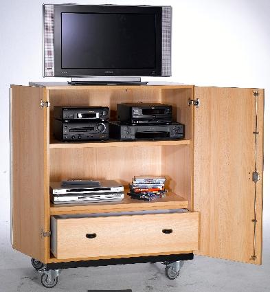 Descriptif du produit :Structure en panneau de particules mélaminé épaisseur 25 mm avec chants plaqués épaisseur 2 mm.Cadre métallique avec 4 roulettes Ø 9 cm dont 2 avec frein.1 tablette fixe et 2 réglables (épaisseur 25 mm).Poids supporté par tablette 15 kg.Fond du meuble en mélaminé épaisseur 25 mm, avec passe-câbles, obturateurs et grille d\'aération intégrés.125 kg.