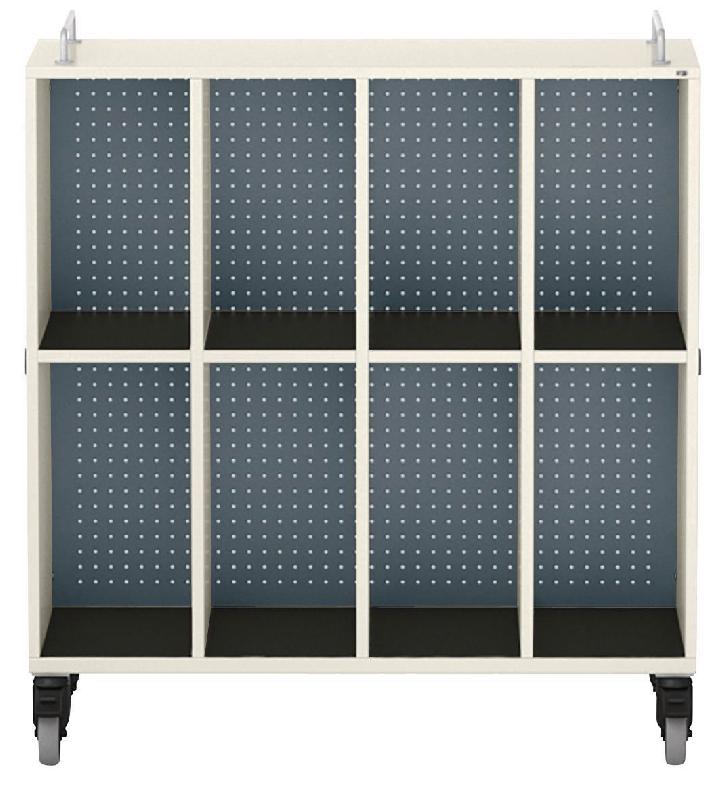 Meuble mobile pour cartables en LIGNOpal, panneau de particules fines mélaminé avec chants collés en matière synthétique (MS).Avec 3 parois intermédiaires collées.Colonne perforée (25 mm) avec tablettes et panneau arrière en tôle d\'acier perforée.4 colonnes avec 2 compartiments pour sacs d\'école, et tapis de protection antidérapants en caoutchouc.Aimants fixés sur les parois latérales pour la liaison avec d\'autres éléments.2 barres de préhension métalliques fixées sur l\'armoire.Livré monté.