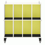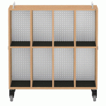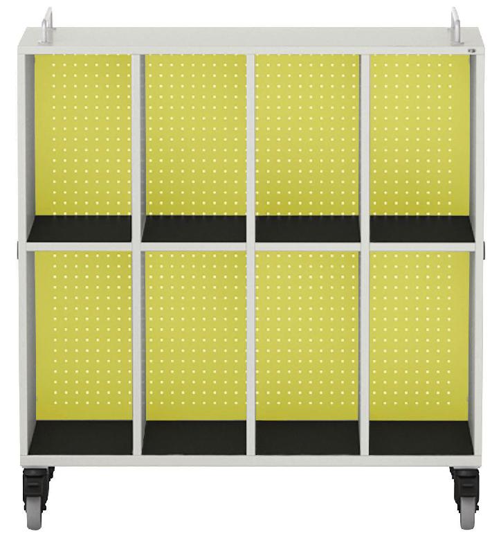 Meuble mobile pour cartables en LIGNOpal, panneau de particules fines mélaminé avec chants collés en matière synthétique (MS).Avec 3 parois intermédiaires collées.Colonne perforée (25 mm) avec tablettes et panneau arrière en tôle d\'acier perforée.4 colonnes avec 2 compartiments pour sacs d\'école, et tapis de protection antidérapants en caoutchouc.Aimants fixés sur les parois latérales pour la liaison avec d\'autres éléments.2 barres de préhension métalliques fixées sur l\'armoire.Livré monté.
