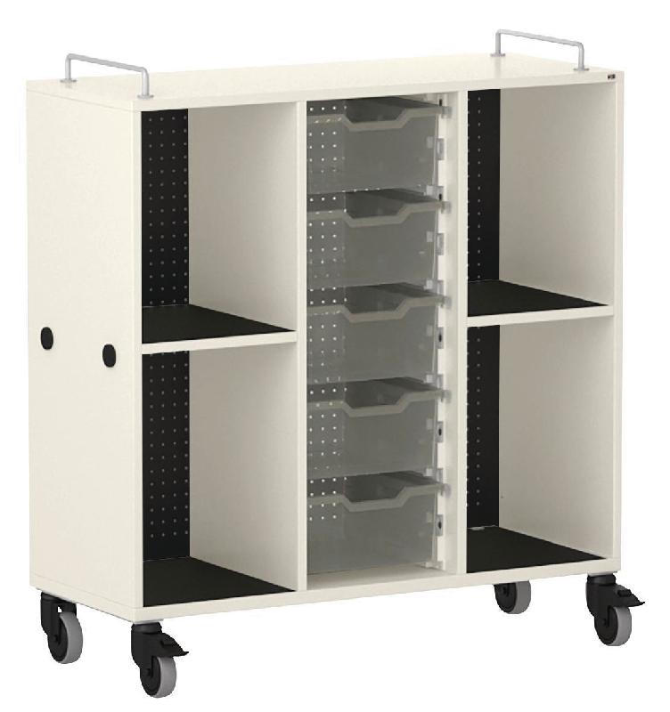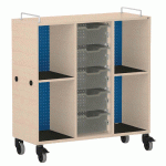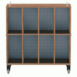Meuble mobile pour cartables en LIGNOpal, panneau de particules fines mélaminé avec chants collés en matière synthétique (MS).Avec 2 parois intermédiaires collées.Colonne perforée (25 mm) avec tablettes et panneau arrière en tôle d\'acier perforée.1 colonne avec 5 bacs en plastique, hauteur 15 cm, sur rail de guidage.2 colonnes, gauche et droite, avec compartiments pour sacs d\'école, ...