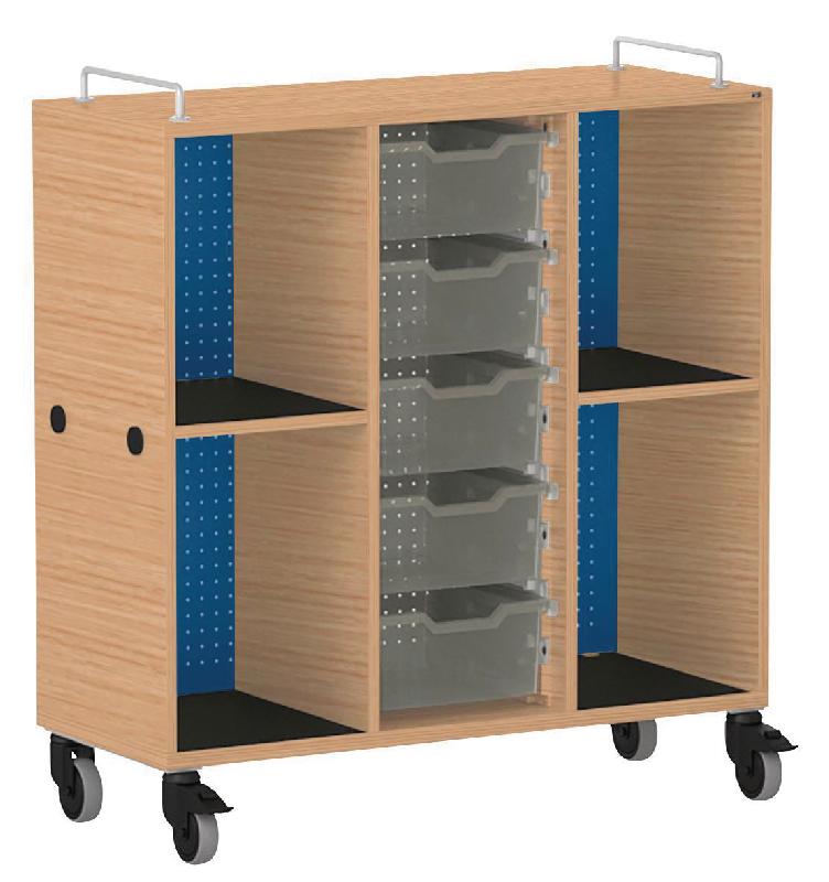 Meuble mobile pour cartables en LIGNOpal, panneau de particules fines mélaminé avec chants collés en matière synthétique (MS).Avec 2 parois intermédiaires collées.Colonne perforée (25 mm) avec tablettes et panneau arrière en tôle d\'acier perforée.1 colonne avec 5 bacs en plastique, hauteur 15 cm, sur rail de guidage.2 colonnes, gauche et droite, avec compartiments pour sacs d\'école, ...