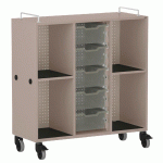 Meuble mobile pour cartables en LIGNOpal, panneau de particules fines mélaminé avec chants collés en matière synthétique (MS).Avec 2 parois intermédiaires collées.Colonne perforée (25 mm) avec tablettes et panneau arrière en tôle d\'acier perforée.1 colonne avec 5 bacs en plastique, hauteur 15 cm, sur rail de guidage.2 colonnes, gauche et droite, avec compartiments pour sacs d\'école, ...