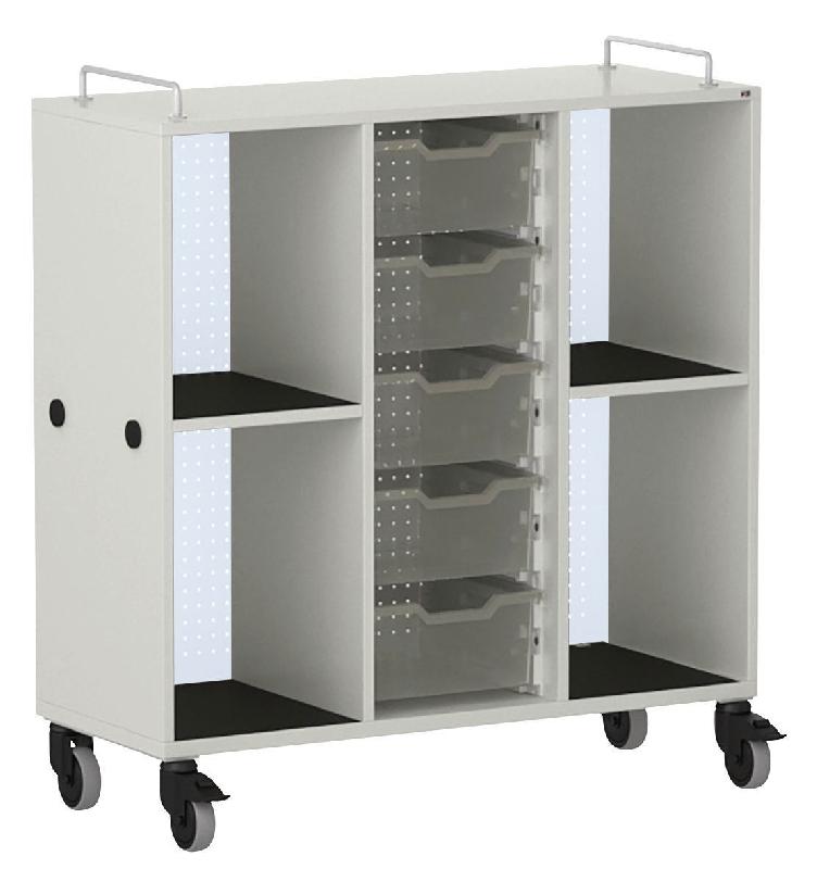 Meuble mobile pour cartables en LIGNOpal, panneau de particules fines mélaminé avec chants collés en matière synthétique (MS).Avec 2 parois intermédiaires collées.Colonne perforée (25 mm) avec tablettes et panneau arrière en tôle d\'acier perforée.1 colonne avec 5 bacs en plastique, hauteur 15 cm, sur rail de guidage.2 colonnes, gauche et droite, avec compartiments pour sacs d\'école, ...