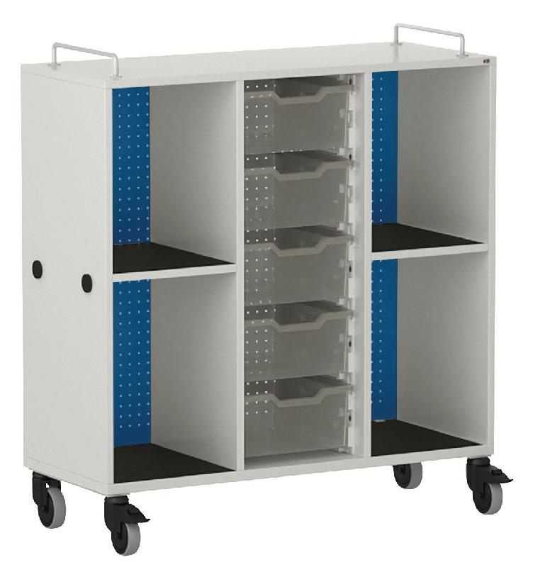 Meuble mobile pour cartables en LIGNOpal, panneau de particules fines mélaminé avec chants collés en matière synthétique (MS).Avec 2 parois intermédiaires collées.Colonne perforée (25 mm) avec tablettes et panneau arrière en tôle d\'acier perforée.1 colonne avec 5 bacs en plastique, hauteur 15 cm, sur rail de guidage.2 colonnes, gauche et droite, avec compartiments pour sacs d\'école, ...