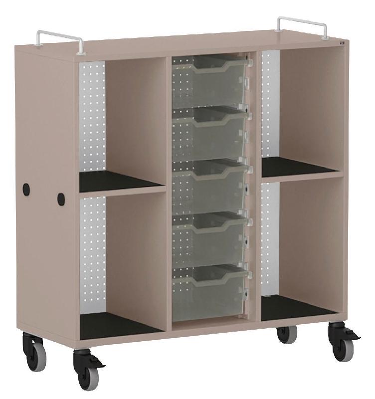 Descriptif du produit :Meuble mobile pour cartables en LIGNOpal, panneau de particules fines mélaminé avec chants collés en matière synthétique (MS).Avec 2 parois intermédiaires collées.Colonne perforée (25 mm) avec tablettes et panneau arrière en tôle d\'acier perforée.1 colonne avec 5 bacs en plastique, hauteur 15 cm, sur rail de guidage.2 colonnes, gauche et droite, avec compartiments pour sacs d\'école, ...