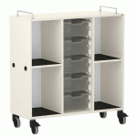 Meuble mobile pour cartables en LIGNOpal, panneau de particules fines mélaminé avec chants collés en matière synthétique (MS).Avec 2 parois intermédiaires collées.Colonne perforée (25 mm) avec tablettes et panneau arrière en tôle d\'acier perforée.1 colonne avec 5 bacs en plastique, hauteur 15 cm, sur rail de guidage.2 colonnes, gauche et droite, avec compartiments pour sacs d\'école, ...
