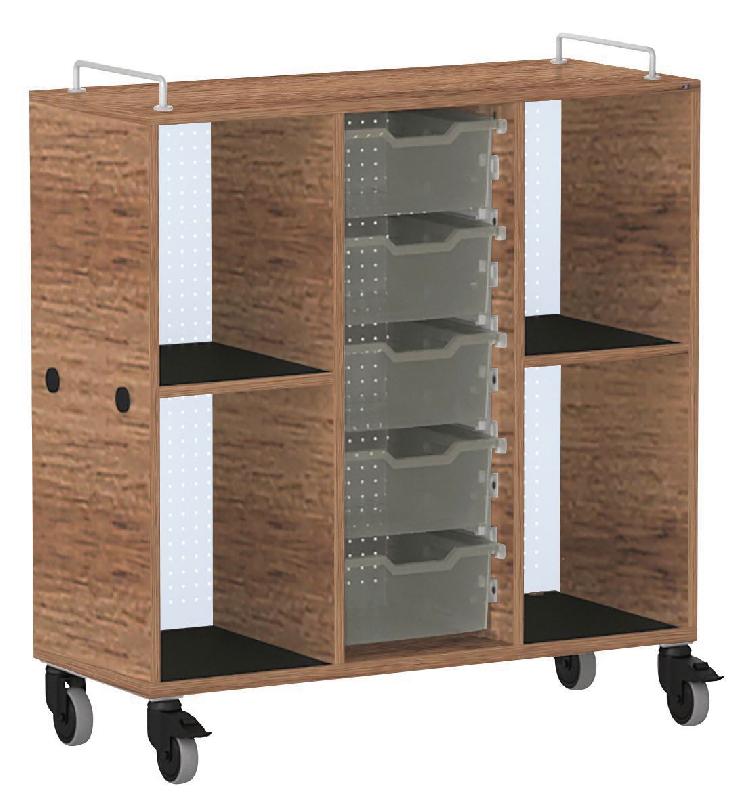 Meuble mobile pour cartables en LIGNOpal, panneau de particules fines mélaminé avec chants collés en matière synthétique (MS).Avec 2 parois intermédiaires collées.Colonne perforée (25 mm) avec tablettes et panneau arrière en tôle d\'acier perforée.1 colonne avec 5 bacs en plastique, hauteur 15 cm, sur rail de guidage.2 colonnes, gauche et droite, avec compartiments pour sacs d\'école, ...