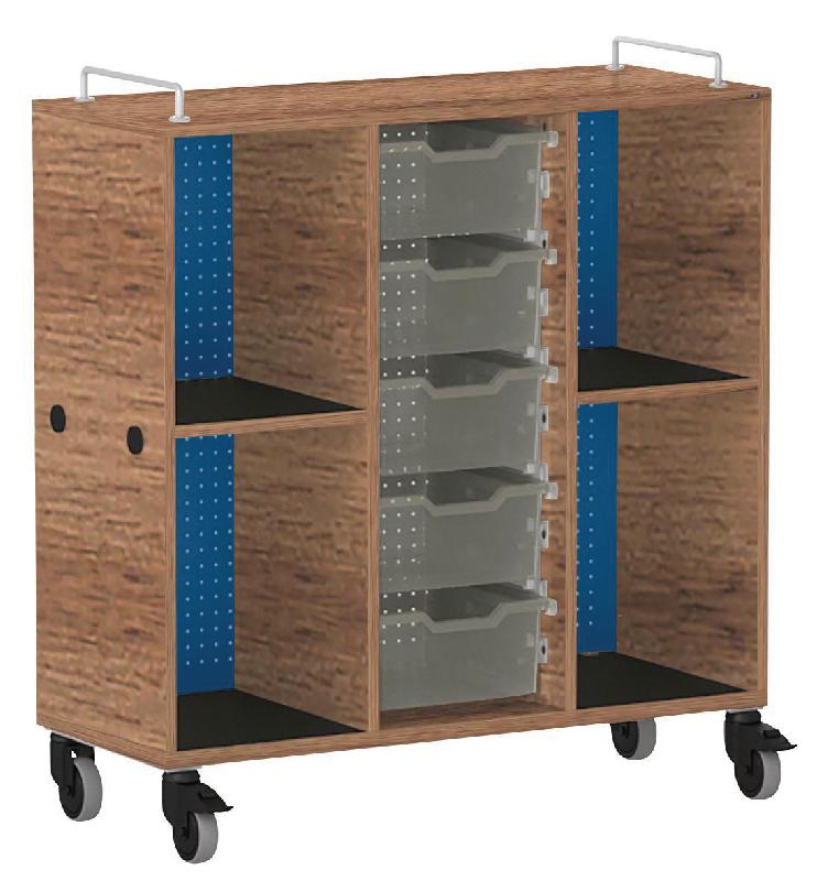 Meuble mobile pour cartables en LIGNOpal, panneau de particules fines mélaminé avec chants collés en matière synthétique (MS).Avec 2 parois intermédiaires collées.Colonne perforée (25 mm) avec tablettes et panneau arrière en tôle d\'acier perforée.1 colonne avec 5 bacs en plastique, hauteur 15 cm, sur rail de guidage.2 colonnes, gauche et droite, avec compartiments pour sacs d\'école, ...