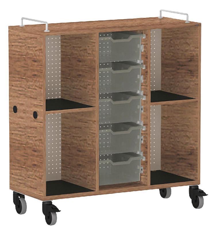 Meuble mobile pour cartables en LIGNOpal, panneau de particules fines mélaminé avec chants collés en matière synthétique (MS).Avec 2 parois intermédiaires collées.Colonne perforée (25 mm) avec tablettes et panneau arrière en tôle d\'acier perforée.1 colonne avec 5 bacs en plastique, hauteur 15 cm, sur rail de guidage.2 colonnes, gauche et droite, avec compartiments pour sacs d\'école, ...