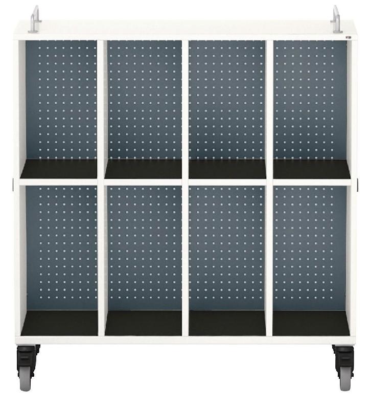Meuble mobile pour cartables en LIGNOpal, panneau de particules fines mélaminé avec chants collés en matière synthétique (MS).Avec 3 parois intermédiaires collées.Colonne perforée (25 mm) avec tablettes et panneau arrière en tôle d\'acier perforée.4 colonnes avec 2 compartiments pour sacs d\'école, et tapis de protection antidérapants en caoutchouc.Aimants fixés sur les parois latérales pour la liaison avec d\'autres éléments.2 barres de préhension métalliques fixées sur l\'armoire.Livré monté.