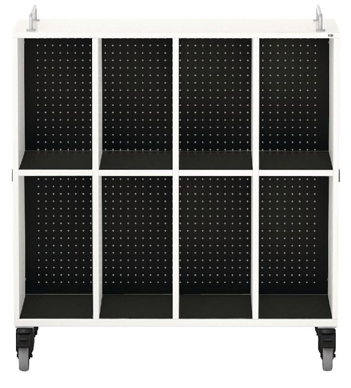 Meuble mobile pour cartables en LIGNOpal, panneau de particules fines mélaminé avec chants collés en matière synthétique (MS).Avec 3 parois intermédiaires collées.Colonne perforée (25 mm) avec tablettes et panneau arrière en tôle d\'acier perforée.4 colonnes avec 2 compartiments pour sacs d\'école, et tapis de protection antidérapants en caoutchouc.Aimants fixés sur les parois latérales pour la liaison avec d\'autres éléments.2 barres de préhension métalliques fixées sur l\'armoire.Livré monté.