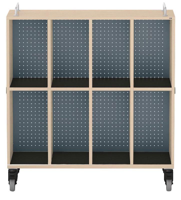 Meuble mobile pour cartables en LIGNOpal, panneau de particules fines mélaminé avec chants collés en matière synthétique (MS).Avec 3 parois intermédiaires collées.Colonne perforée (25 mm) avec tablettes et panneau arrière en tôle d\'acier perforée.4 colonnes avec 2 compartiments pour sacs d\'école, et tapis de protection antidérapants en caoutchouc.Aimants fixés sur les parois latérales pour la liaison avec d\'autres éléments.2 barres de préhension métalliques fixées sur l\'armoire.Livré monté.