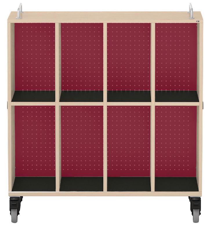 Meuble mobile pour cartables en LIGNOpal, panneau de particules fines mélaminé avec chants collés en matière synthétique (MS).Avec 3 parois intermédiaires collées.Colonne perforée (25 mm) avec tablettes et panneau arrière en tôle d\'acier perforée.4 colonnes avec 2 compartiments pour sacs d\'école, et tapis de protection antidérapants en caoutchouc.Aimants fixés sur les parois latérales pour la liaison avec d\'autres éléments.2 barres de préhension métalliques fixées sur l\'armoire.Livré monté.