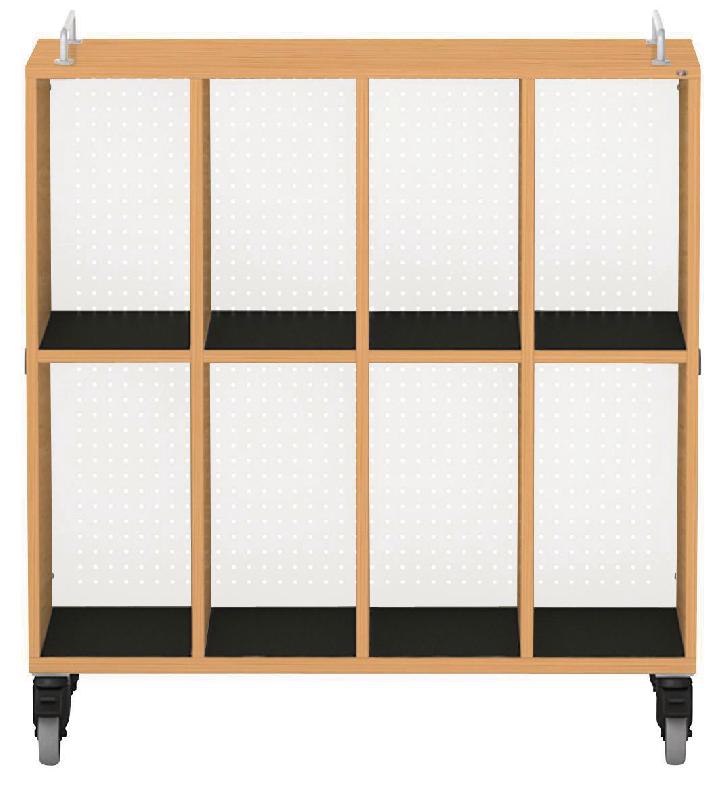 Meuble mobile pour cartables en LIGNOpal, panneau de particules fines mélaminé avec chants collés en matière synthétique (MS).Avec 3 parois intermédiaires collées.Colonne perforée (25 mm) avec tablettes et panneau arrière en tôle d\'acier perforée.4 colonnes avec 2 compartiments pour sacs d\'école, et tapis de protection antidérapants en caoutchouc.Aimants fixés sur les parois latérales pour la liaison avec d\'autres éléments.2 barres de préhension métalliques fixées sur l\'armoire.Livré monté.