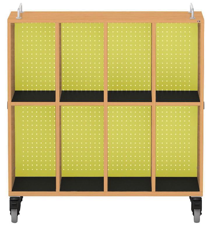 Meuble mobile pour cartables en LIGNOpal, panneau de particules fines mélaminé avec chants collés en matière synthétique (MS).Avec 3 parois intermédiaires collées.Colonne perforée (25 mm) avec tablettes et panneau arrière en tôle d\'acier perforée.4 colonnes avec 2 compartiments pour sacs d\'école, et tapis de protection antidérapants en caoutchouc.Aimants fixés sur les parois latérales pour la liaison avec d\'autres éléments.2 barres de préhension métalliques fixées sur l\'armoire.Livré monté.