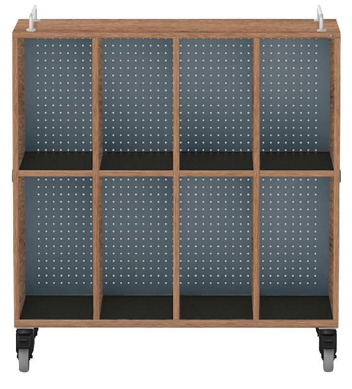 Meuble mobile pour cartables en LIGNOpal, panneau de particules fines mélaminé avec chants collés en matière synthétique (MS).Avec 3 parois intermédiaires collées.Colonne perforée (25 mm) avec tablettes et panneau arrière en tôle d\'acier perforée.4 colonnes avec 2 compartiments pour sacs d\'école, et tapis de protection antidérapants en caoutchouc.Aimants fixés sur les parois latérales pour la liaison avec d\'autres éléments.2 barres de préhension métalliques fixées sur l\'armoire.Livré monté.