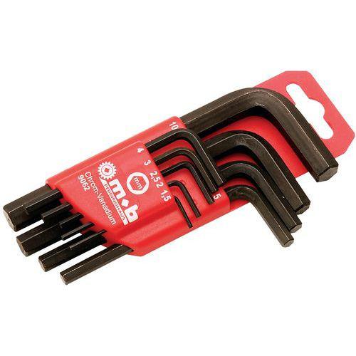 Descriptif du produit :Jeu de 9 Clé mâles CRV Mob Capacité (Dimensions) : 1.5 à 10 mm Modèle : Clés mâles Nb de clés : 9 Nb de pans : 6 Réf. Fabricant : 9062011101 Etui de 9 clés 1,5 2 2,5 3 4 5 6 8 10 mm. QUALITÉ : Acier ChromeVanadium : qualité professionnelle garantie NF ISO 2936. Etui plastique : se transforme en poignée et permet d'exercer des serrages plus puissants. Identification claire ...
