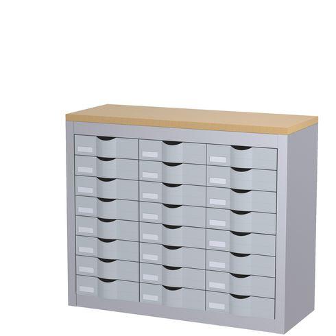 - Pour un classement organisé et esthétique, misez sur le module 3 colonnes Paperflow. Ce modèle profite d’une structure métallique époxy anti-rayures et antichocs. Son dessus est doté d’un panneau de particules mélaminées résistant à la cassure (épaisseur de 2,5 cm). Le décor hêtre de ce panneau s’adapte à pratiquement tous les styles de décoration. Pratique, le module est muni de vérins réglables pour s’ajuster à la hauteur voulue. D’une grande capacité, ce module possède 24 tiroirs répartis en 3 colonnes. Fabriqués en polystyrène, ils résistent efficacement à la flexion. Grâce à leur forme ergonomique, les tiroirs se manipulent aisément. Vous n’aurez aucun mal à classer des documents à plat de format 24 x 32 cm au maximum. Afin d’identifier le contenu de chaque tiroir, le meuble bénéficie de porte-étiquettes avec des étiquettes fournies. Article livré monté et muni des tiroirs. Dimensions du module : H 75 x L 87 x P 33,5 cm. Dimensions d’un tiroir : H 6,2 x L 24 x P 32 cm. 2 couleurs au choix : gris ou gris anthracite.