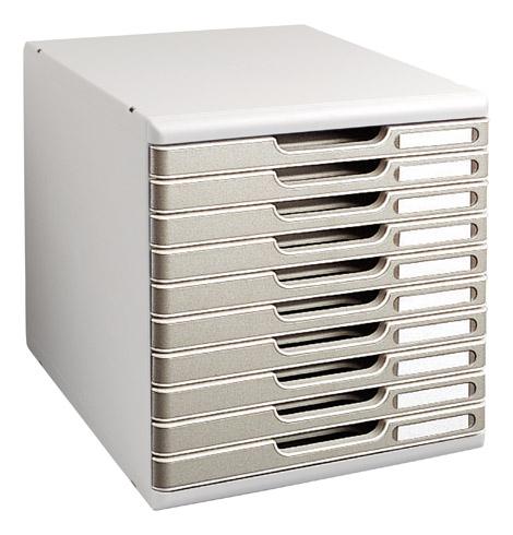 - Si vous cherchez un petit meuble pour ranger et classer vos papiers, le module de classement 10 tiroirs Exacompta Modulo va vous intéresser. Ses avantages :fabriqué dans du polystyrène antichoc et antistatique, cet essentiel du rangement témoigne d’une grande robustesseil convient aux documents jusqu’au format 24 x 32 cm. Sachez qu’un tiroir peut contenir jusqu’à 130 feuillesses 10 tiroirs interchangeables, juxtaposables et superposables vous assurent une organisation optimale dans vos classementsgrâce aux porte-étiquettes (étiquettes fournies) avec protection plexi, il vous sera facile d’identifier le contenu de chaque tiroirce dernier est équipé d’une butée d’arrêt évitant son basculement. Il a été aussi conçu pour assurer une manipulation aisée, ainsi qu’un coulissement parfait et silencieux. Afin de faciliter la prise des documents, le fond du tiroir est équipé d’un évidementmodule fourni avec clips d’assemblage, patins et étiquettes. Dimensions utiles d'un tiroir : H 2,6 x L 25 x P 32,5 cmles dimensions hors tout d’un module sont de H 32,5 x L 29 x P 35 cm. Le coffre existe en gris clair ou gris foncé, coins arrondis. Juxtaposables et superposables, ces modules de classement 10 tiroirs Exacompta vous permettront de réaliser de véritables murs de classement. Grâce aux clips d'assemblage et aux patins fournis, chaque module restera toujours parfaitement en place.A vous de choisir vos propres coloris ! Pour le coffre : gris clair ou gris foncé. Pour les tiroirs : noir, noir avec bordures multicolores, gris, bordeaux ou bleu. Trouvez l'inspiration selon votre style ou vos envies !Chez Bruneau, il est proposé avec 25 ans de garantie, gage de sa qualité.