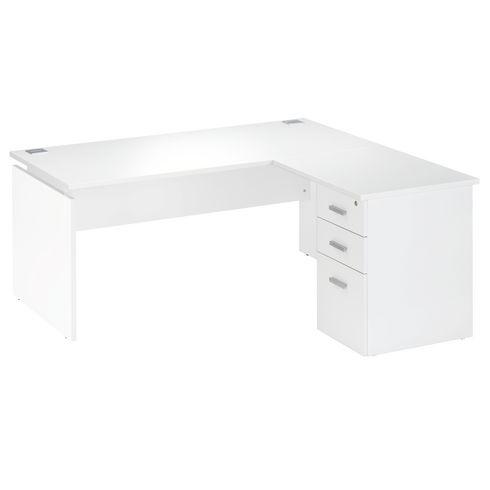 - Profitez d’un espace de travail spacieux et pratique en choisissant le bureau d’angle Intuitiv’ qui se compose d’un bureau et d’un retour suspendu sur caisson.Composition :Le bureau :Panneaux de particules de 25 mm d’épaisseur garantissant sa robustesse.Revêtement mélaminé blanc traité antireflets.Chants droits antichocs d’épaisseur 2 mm.Piètement plein et voile de fond.Retour suspendu sur caisson :3 tiroirs dont 2 pour un rangement à plat et 1 pour dossiers suspendus.Verrouillage par serrure du tiroir supérieur.Poignées pratiques en métal avec finition alu brossé.Le retour est positionnable à droite ou à gauche, selon vos besoins, lors du montage.Dimensions : Plateau du bureau : H 72,5 x L 160 x P 80 cm.Plateau du retour : H 72,5 x L 80 x P 60 cm.Dimensions totales : H 72,5 x L 160 x P 160 cm.Accessoires fournis :2 obturateurs passes-câbles sur le plateau du bureau, facilitant le raccord des branchements sans encombrer votre espace de travail.Accessoires en option :Goulotte passe-câbles universelle à visser sous plateau.Montage :Livré démonté. Montage en option. Il faut noter que le retour est positionnable à droite ou à gauche, selon vos besoins, lors du montage.Normes et environnement :Ce produit est écoresponsable car il a été fabriqué à base de 50 % minimum de matériau recyclé.Ce produit est écoresponsable car il est certifié PEFC. Label international, PEFC assure une gestion durable des forêts et garantit l’origine et la traçabilité du bois utilisé dans la fabrication des produits. Fabrication française.
