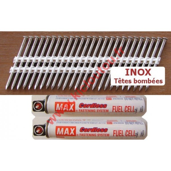 Descriptif du produit :Pack de pointes clous 34° crantées INOX 3.1x50 tête bombée boite de 2200 avec gaz Idéales en bardage, terrasse, maison ossature bois