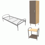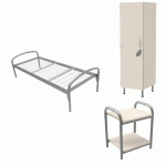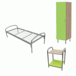 Descriptif du produit :Lit simple tout métal sommier agglo.Armoire 1 porte avec serrure à moraillon (cadenas non livré) : 60 x 180 x 53 cmArmoire sur piètement métal avec vérins de réglage.Chevet sans tiroir : 44 x 53 x 35 cm.