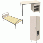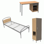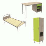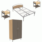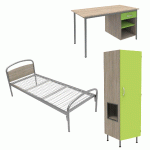 Descriptif du produit :Lit tête panneau, sommier aggloméré.Armoire 1 porte niche à droite avec serrure à moraillon (cadenas non livré) 60 x 180 x 53 cmArmoire sur piètement métal avec vérins de réglage.Bureau avec 1 tiroir et niche : 120 x 75 x 60 cm.