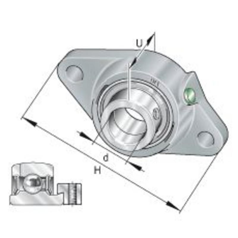 Ensemble composé d'un corps de palier applique en fonte à deux trous et d'un roulement auto-aligneur graissé. Compense les défauts d’alignement statique de l’arbre jusqu’à 2,5° avec regraissage et jusqu’à 5° sans regraissage.