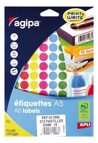 - La pastille adhésive Agipa est une solution astucieuse pour repérer rapidement et facilement les cartons dans l’entrepôt, les dossiers ou encore pour identifier les prix et les références. Vous pouvez facilement les personnaliser par écriture manuelle ou par impression. Pratiques, elles sont compatibles avec tous types d’imprimantes (laser ou jet d’encre) et aussi avec les copieurs. N’oubliez pas de vous procurer le logiciel d’impression gratuit sur [...] à l'aide du code logiciel 11996. Ces pastilles sont d’ailleurs proposées par planches A5 afin de simplifier grandement leur indexation.Cet article est disponible par boîte de 7 feuilles de 96 pastilles, soit 672 pastilles au total. Il est vendu en 5 couleurs assorties : bleu, vert, rouge, jaune et rose.Ce produit est écoresponsable car il est certifié FSC®. Organisation internationale, FSC® promeut une gestion responsable des forêts dans le monde entier et garantit la traçabilité du bois utilisé dans la fabrication des produits.