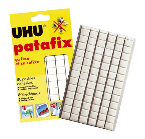 - UHU Patafix – La solution astucieuse pour fixer simplement !UHU Patafix est une pâte adhésive détachable et réutilisable, conçue pour fixer rapidement et proprement de petits objets sur une variété de surfaces. Elle représente une alternative simple et efficace aux clous, punaises et ruban adhésif.Pratique : fixe vos objets rapidement sans percer ni utiliser d'outilsPolyvalente : se fixe sur le bois, le ciment, le verre, le métal, les plastiques et la porcelaineRéutilisation pratique : facilement détachable et réutilisable, ce qui le rend à la fois économique et durableFixation rapide et propre : pas de clous, pas de saleté, aucune détérioration des surfaces Testée sous contrôle dermatologique : respectueuse de votre peau ( résultat « TRÈS BIEN » lors de tests réalisés par l'institut indépendant Dermatest®)Fabriquée en Allemagne : gage de qualité et de fiabilité.Idéale pour : Fixer des affiches, photos, cartes postales ou dessins sur des murs et meublesMaintenir des décorations, câbles ou petits appareils électroniquesParfaite pour les activités à la maison, au bureau ou à l'écolePrécautions d’usage :Ne pas utiliser sur papier peint ou surfaces récemment peintesTester sur une petite zone avant application sur des surfaces sensiblesMode d’Emploi :Les surfaces à fixer doivent être propres, sèches et dépourvues de poussière ou de traces de graisse.Détachez une pastilleMalaxez jusqu’à ce qu’elle devienne soupleAppliquez sur l’objet à fixerPressez fermement contre la surfacePour réutiliser, recommencez à l’étape 2. Enlevez les éventuels résidus en tamponnant avec une autre pastille.Cet article est proposé sur une plaque de 80 pastilles blanches dans un étui de 6 bandes de 14 cm prédécoupées.