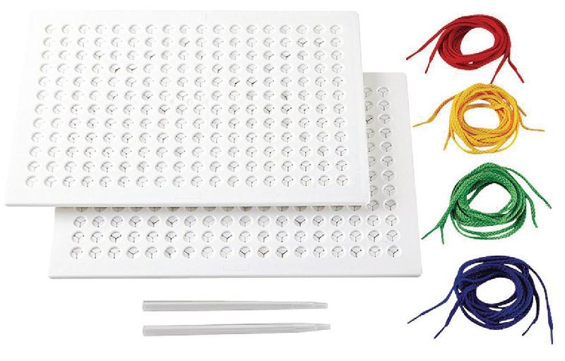 Descriptif du produit :L\'ensemble comprend : 2 tablettes en plastique souple, 2 crayons guide-fil en plastique transparent, 8 lacets (rouge, jaune vert et bleu). L/l/ép. tablette : 27,5 x 19,5 x 1,2 cm. L crayon guide-fil : 13,5 cm. L lacet : 95 cm.