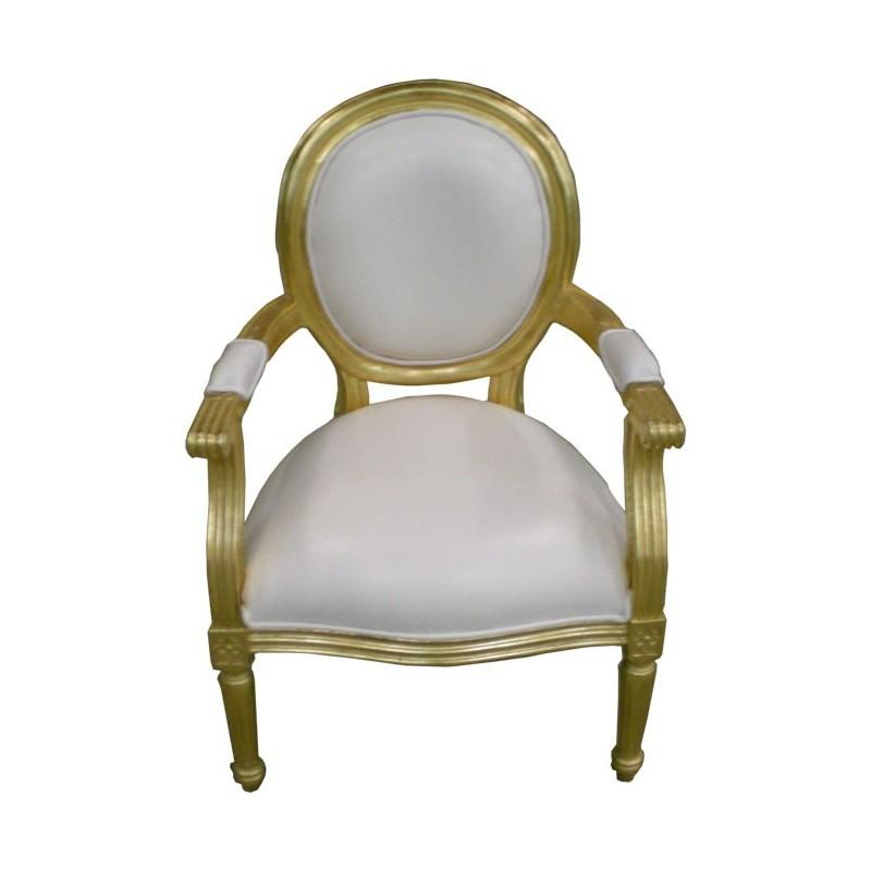 Fauteuil cabriolet en bois argenté et imitation cuir blanc Dim: H 102 L 57 PRO 55 cm ce fauteuil argenté fait partie de notre coll ...