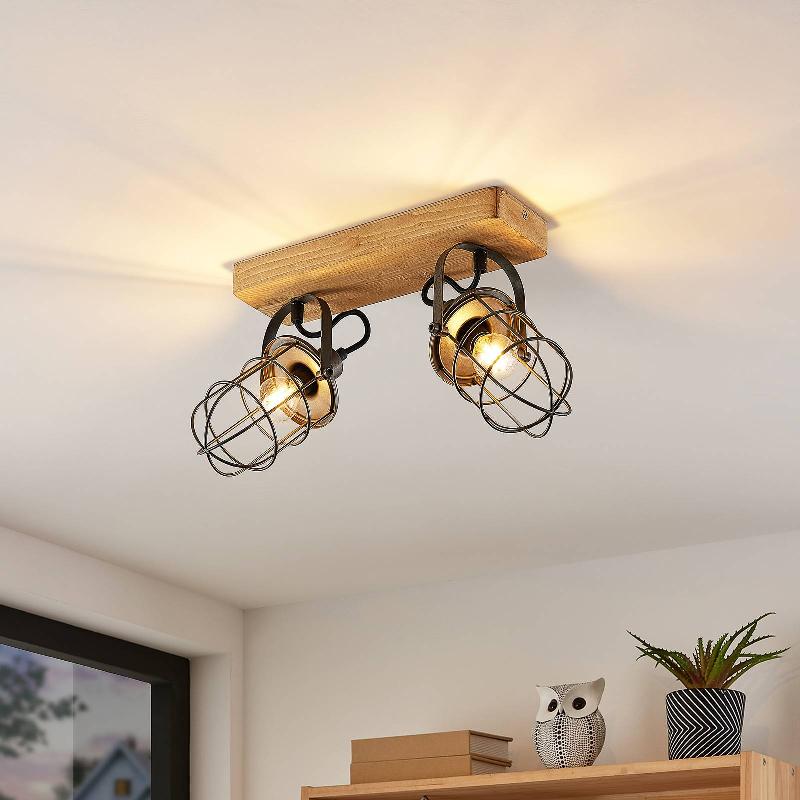 Lampe à suspension Serima à cinq lampes avec abat-jour en cage sur poutres en bois Le luminaire suspendu Serima à cinq lampes resp ...